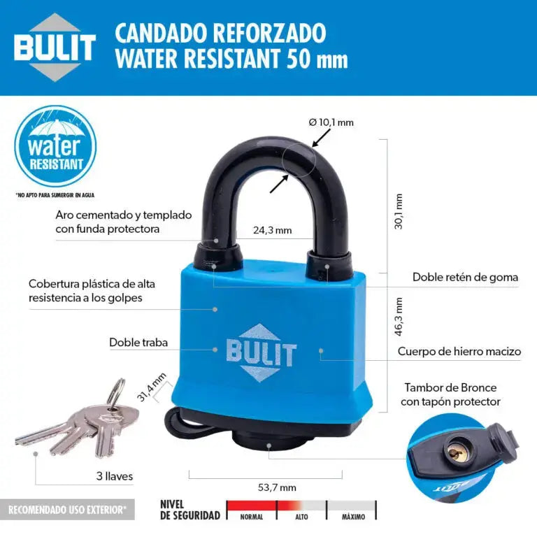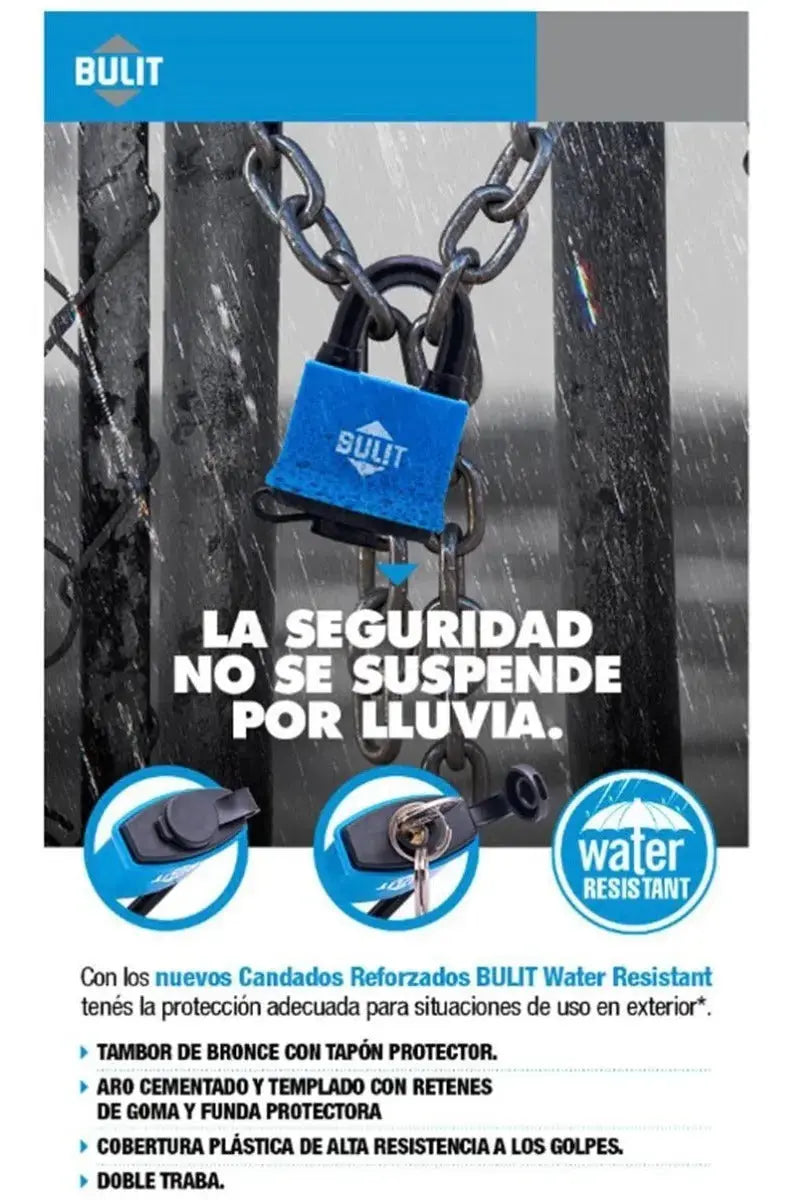 - Con los nuevos Candados Reforzados Doble Traba BULIT Water Resistant, tenés la protección adecuada para situación de uso en exterior. Se trata de un candado pensado especialmente para estar al aire libre y que las inclemencias del tiempo no lo dañen.