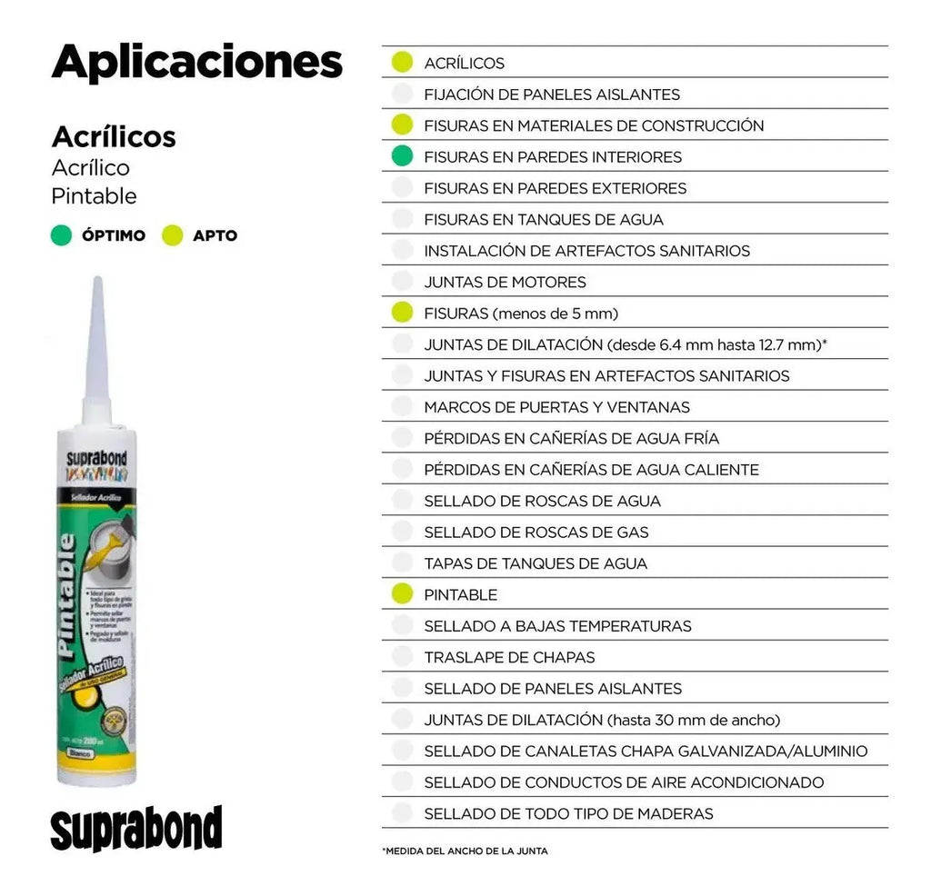 - Sellador acrílico flexible Suprabond de fácil aplicación. Es pintable con pinturas al látex y al aceite. Una vez curado, evita la adherencia de polvo (no deja tac residual), lo que permite a la superficie quedarse sin pintar.